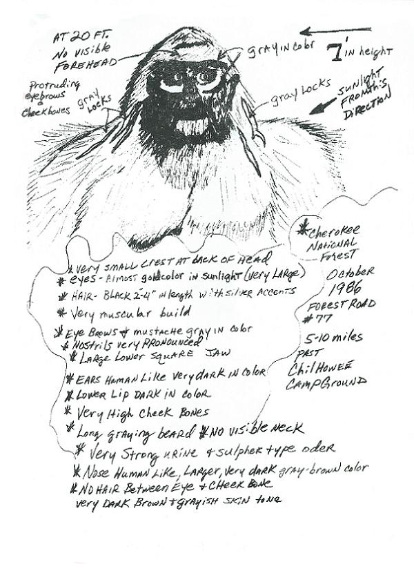 I smelled a strong musty urine scent. Then I heard a low deep slow grunt not 25 ft. from me. I looked in the direction of the noise and standing behind some underbrush at the creek, I saw a large black and gray thing standing looking right at me! It's not no bear I thought immediatly. It had a rather large roundish head with a lot of gray on it with a very noticable eyebrow and mustache accent. It's nose was large and mostly flat and blackish in color as well as it's lower lip. I remember it having a large square shaped lower jaw. I was very upset as my heart was pounding like a drum as I worked my way back to my car door, it just stared at me. It's eyes I recall is what scared me the most. They were large also and had a bright brown appearance and I never took my eyes off him.