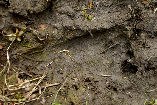 Tuesday afternoon, the 26th, I took this picture near the edge of the smallest ponds near the parking lot. I took the photo because I thought it was odd that a bare human-looking footprint would be there in the mud, fairly fresh, as the nightly temperatures had been near or at freezing recently, and the water/mud would have been quite cold too. The more I looked at the footprint, I noticed how flat the sole was and how even the toes were. I don't know what to make of it, so I'm reporting it here. ALSO NOTICED: 3 whoops heard back in early March/late Feb.; not heard since. OTHER WITNESSES: None other than myself and the photos. OTHER STORIES: No TIME AND CONDITIONS: Photos taken at 4:30pm; gray cloudy sky, about 50F, strong north wind (30-40mph); rained the previous day or so. ENVIRONMENT: Near the edge of the smallest pond, very close to parking lot so very open spaces, but not many people around that afternoon as it was quite chilly.