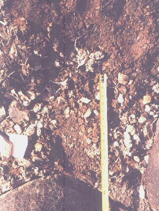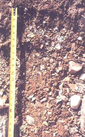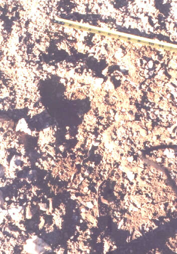 In the heel portion of the foot, there is a small ridge of gravel raised at the 12.5 to 14 inch mark that peaks at about 13 inches from the tip of the big toe. This rise that transverses the track is the result of heel strike when the foot is placed during normal walking motion, in that the heel throws up a small pressure ridge of soil material when it comes in contact with the ground. The foot then rolls over and presses down on this ridge, thereby compressing it somewhat.