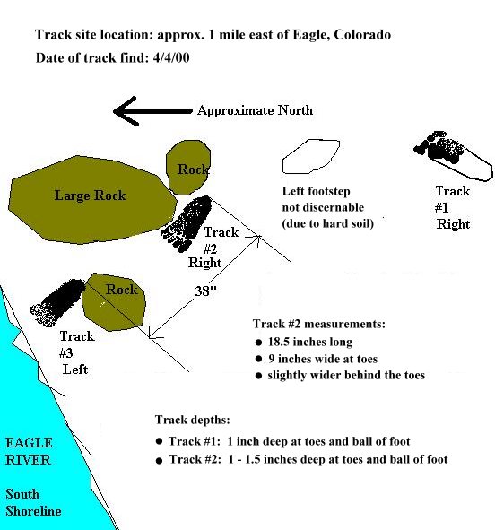 In early April 2000, Colorado resident Bill B. noticed three large human-like tracks while fly fishing along the south shoreline of the Eagle River, approximately one mile east of Eagle, Colorado. The tracks caught Bill's attention because a different Colorado fisherman (Vern P. of Grand Junction, Colorado) reported finding a number of 18 to 20 inch long human-like tracks along the same river a few days prior.
