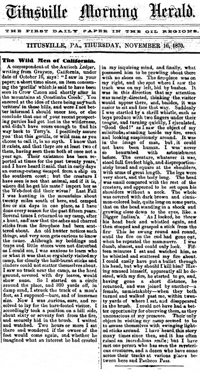 Old newspaper article (Titusville Morning Herald - Pennsylvania) about sightings near Orestimba Creek in the Diablo (Devil) Mountains