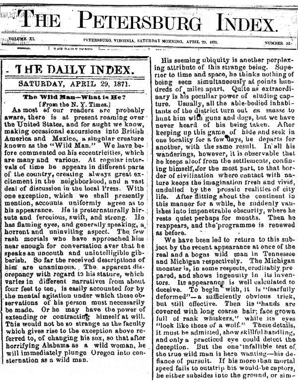 The article below, titled "The Wild Man - What is He?", was originally published in the New York Times in 1871. Shortly afterward this article was re-printed in the Petersburg Index (Virginia), and assumably other newspapers as well.