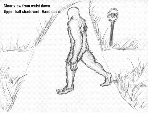 The witness visited the site the next day and tried to cross the same road in a sprint and was only able to do it in four and half steps. The witness is 5' 8" tall. This attests to the size of the animal. The witness estimated the height as approximately eight feet tall. It had a very thick build and massive legs. He described it as twice the size of a good size man.