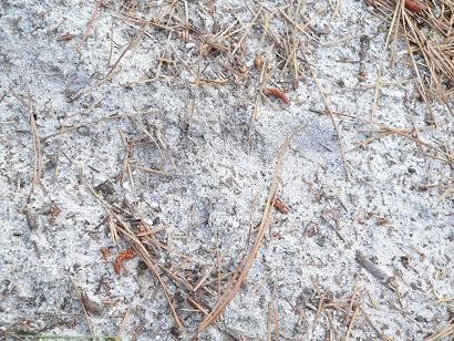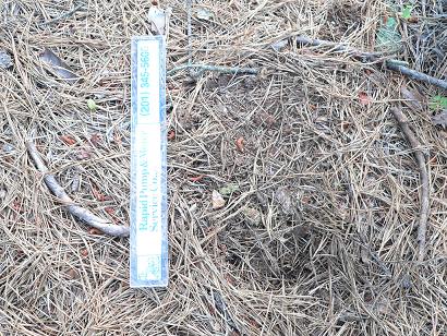 Possible knuckles print and tracks where found and photographed, which are attached below. The tracks were not well defined as the forest floor was covered with a thick layer of pine needles. One track measured in at 12" long by 6" wide. There was a row of tracks in the pine needles leading deeper into the forest off of the trail. These tracks had little or no definition, but you could make out the path by the disturbance of the pine needles. The tracks were in a straight line and in my opinion were made by a bipedal animal, not a bear or a deer. Also the distance between each track (the gait) was 4 1/2' to 5'.