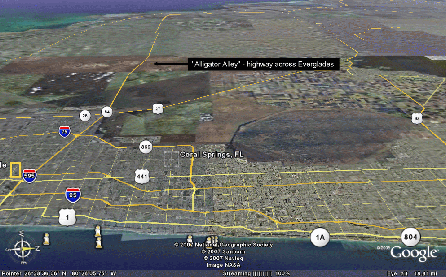 [Graphic below added by editor MM -- Please wait for it to load -- Frame from Google Earth showing Coral Springs, the upper Everglades and Alligator Alley.]