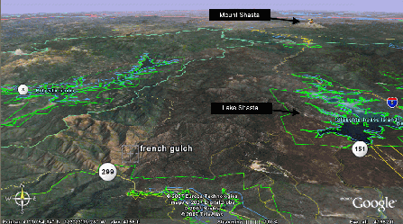 [Graphic below added by editor MM -- Please wait for it to load -- Frame from Google Earth showing location French Gulch area with respect to Mount Shasta , Lake Shasta, Whiskeytown Lake, etc.]