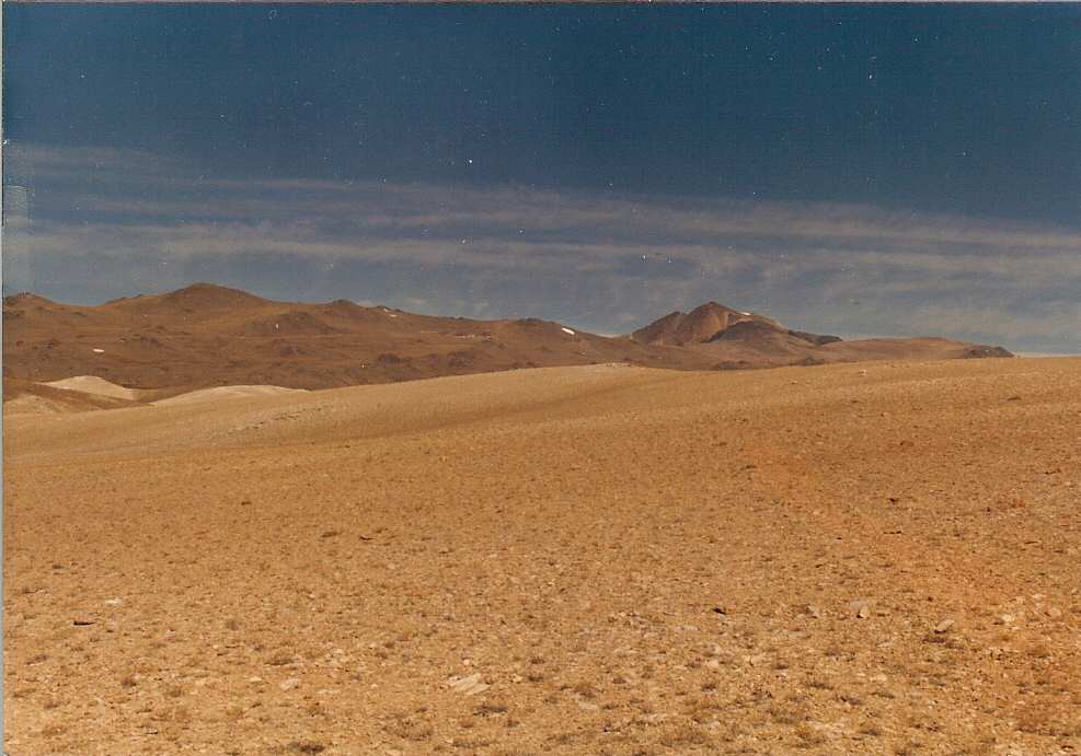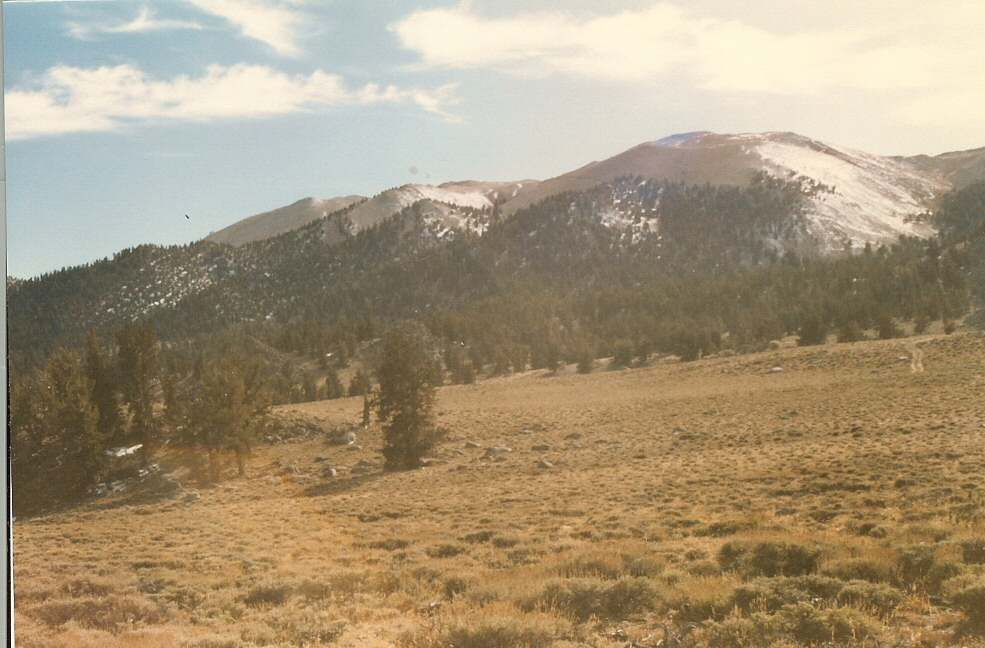 The following photos were taken about twenty years ago by me, a few miles south of Boundary Peak Mountain. Most of the high peaks in this mountain range are on the California side. Some are over 14,000 feet. Montgomery Peak is over 13,400 feet and lies just on the California side of Boundary Peak Mountain. These two mountain peaks are connected by a high ridge/saddle that intersects the state line.