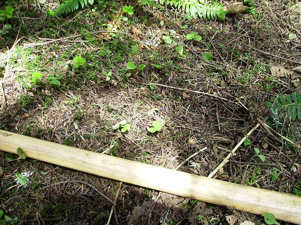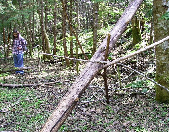 They began to find stick structures in the shape of tripods and tee-pees. There were large ones and very small ones. The interesting thing is that the structures were made with the tips of the poles inserted into the ground and the root end up in the air. They found lines of single poles stuck in the ground, tip end down, like trail markers. They found lean-to type structures made against a large tree, and there was what appeared to be a sleeping nest under it. Inside they found hair, which looks like elk hair, and a full hand print. The hand print was close to human proportions but dinner-plate large. They found a log laying on the ground that had sticks arranged leaning on the log at even intervals.