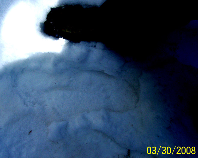 One last curious notation, in one of the pictures he sent me it looks like something urinated. There is a dark orange hole in the snow. Much darker than what would be normal for a person. Our witness has had three other curious encounters those are documented -- Report #1131.