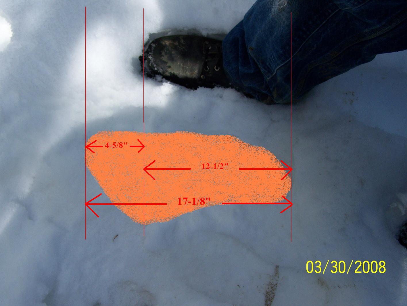 He put his boot next to one of the tracks and took a picture. I have included it below for scale. In our conversation I asked him if he could measure his boot. He did and I was able to determine the size of the impression. Give or take a little, it is approximately 17” long, 8” wide at the ball, and 4-5/8” at the heel. This is not an exact science due to the fact that the Impression was made in snow. It does appear that the track was exposed to the sun and there is some evidence of melting. The snow fall had happened within the last forty-eight hours. Our witness did take a picture showing him attempting to create the same stride length. He could not quite make the same stride. He told me that he is 6’2” tall. I asked him if he could recreate the same stride length and measure from heel of back foot to heel of front foot. He did and said that measurement was 54”. According to the picture he sent me the stride is slightly longer than that.
