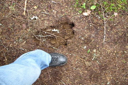 The next morning on a hike along a narrow trail I found what appeared to be a footprint in the dirt. There were no other prints found though the bush on either side is dense and the path narrow. I took a picture of the print alone as well as with my foot along side it. I have a size 11 1/2 boot and the print was quite a bit bigger than my boot. I didn't have anything else to 'measure' or compare the print too. ALSO NOTICED: Next morning on a hike I took a picture of what appears to be a foot print on a narrow path. OTHER WITNESSES: Unknown OTHER STORIES: No TIME AND CONDITIONS: 0215 hours ENVIRONMENT: Provincial Park camp site surrounded on both sides by dense forest