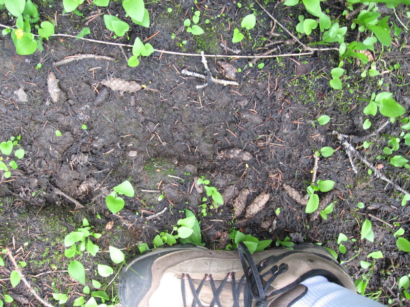I decided to explore the area; I walked by the two other campers and said hi. They had a poodle that barked at me little. I wanted to see if I could look over Tiger Canyon at the valley from where we were so I crossed over to the other side if Kendall Skyline Road. I couldn’t see much through all the trees so I decided to head the other way. I brought a GPS device with me that had topography maps loaded on it. It showed a trail into the Wenaha-Tucannon Wilderness that I wanted to follow. As I started in that direction I noticed a very large track just to the right of a pool of water in some soft mud. It didn’t really look to me as something authentically Bigfoot because the foot seemed thin. I told myself it couldn’t be a footprint of a Sasquatch because I had read some stories a few weeks earlier and thought I could just be imagining it.