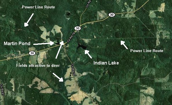 The area is mostly forest, interspersed with cultivated fields that attract deer herds. There are multiple unexposed water sources nearby. There's also a power line route connecting various fields that would be used by deer.
