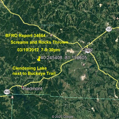 SEASON: Spring MONTH: March DATE: 03/19/2012 STATE: Ohio COUNTY: Harrison County LOCATION DETAILS: [See graphic below with Long/Lat Coordinates] NEAREST TOWN: Cadiz, Ohio NEAREST ROAD: Harrison county road 1 OBSERVED: I was at the back waters of Clendening lake near Cadiz, Ohio with my friend Cj and we heard a man-like scream.