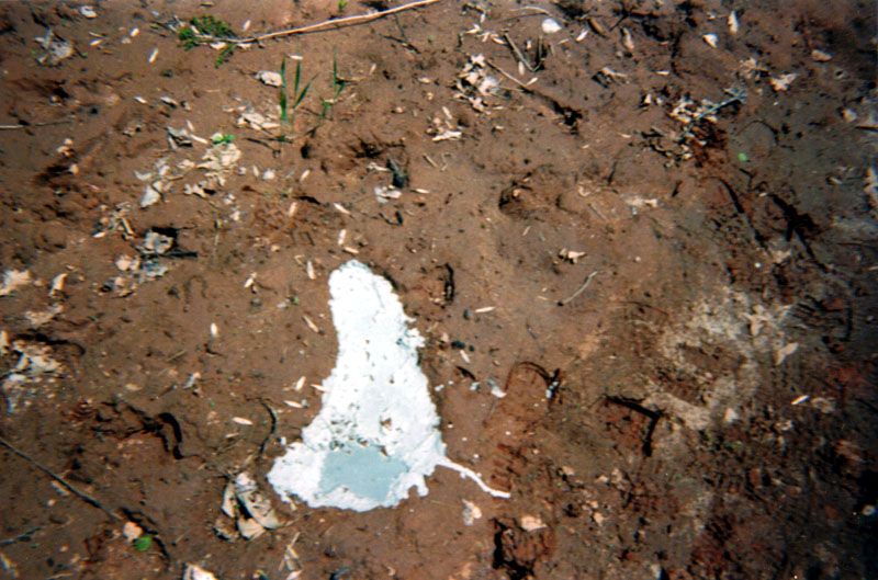 The cast track lacks sufficient detail to determine how it was made or what made it. It can only be said that a sasquatch may have made it (figure 3). The photograph the witness refers to as showing a possible sasquatch could be interpreted as being only a pattern in the leaves. That would be my interpretation of it. It does warrant further scrutiny, however, and the witness is pursuing that.