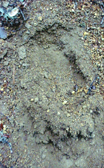 SEASON: Fall MONTH: October DATE: 20 STATE: Washington COUNTY: Skamania County LOCATION DETAILS: Skookum Meadows area, Big Creek NEAREST TOWN: Carson NEAREST ROAD: FR 32 OBSERVED: My original plans were for a trip to northern California to visit the famous Bluff Creek film site and drop off some casts and pictures to the Willow Creek Museum, arriving on this day, the 35th anniversary of it’s making, October 20th. I had talked with Joe Beelart about this trip, because he had just returned from the area with a party of 10, including Peter Byrne, Todd Neiss, film crew and our own Al Berry and Ron Morehead. Joe talked me out of going there by myself because of the terrain and for safety reasons, so I altered my plans. I decided to divide this trip up into three parts… doing some things and going some places I had been meaning to for a long time. Skookum Meadows revisit, Estacada and the Wynooche river drainage. I usually make trips like this in search of areas to investigate for longer periods of time at later dates. I do these scouting trips mostly alone and try to cram as much as possible into them. Oct 19 – Met with Jeff Lemley and his brother around 10:00PM in the Skookum Meadows area to do some late night call blasting. By the time I got there they had already tried a couple of sets. It was quite foggy, but the sound still carried well, with echoes lasting a few seconds after the source stopped. This is the best time to blast out these sounds, late evening, early morning in the fog since the air is quite dense at this time. Interestingly enough, the primates that do use long type calls for communications between members also choose this time of the day to do so. Jeff and Alan Terry have built themselves quite an impressive sound blasting system. It is modular and has very good output. The sound was clear, I heard no distortion or feedback during the blasts he made. It ran off his car battery. I was quite tired and didn’t last too long sitting outside with Jeff and company in the cold, I crawled back into my truck around 11:30PM and quickly fell asleep. My day job work shift gets me out of bed at 2:30AM and I usually work 10 hour days. I was starting this out all wrong. Jeff woke me around midnight and said that they were going back home and that they had heard nothing while I was sleeping. I thanked them for meeting with me and bringing the equipment. I watched them leave. I quickly went back to sleep. Oct 20 – I woke at my usual time – 2:30AM (great!) and started to drive the back roads, visiting the Skookum Meadows Expedition base camp, hill top and ridge top sites as well as the cast site. I wanted to take some measurements, get another average GPS reading after the military eliminated the scramble signal at the cast site and just have a look at the general area during hunting season. One deer and a lone coyote, evidenced by their tracks had visited the cast site. I collected a soil sample, documented the cast site with pictures, GPS and did some tape measurements. I found some interesting things traveling around the area this trip: · A skid mark, looking very much like a human buttock on a road side bank, complete with what might have been hand prints and three impressions that hinted at being bare footprints – 16.5” long x 6” wide at the ball and with toes.