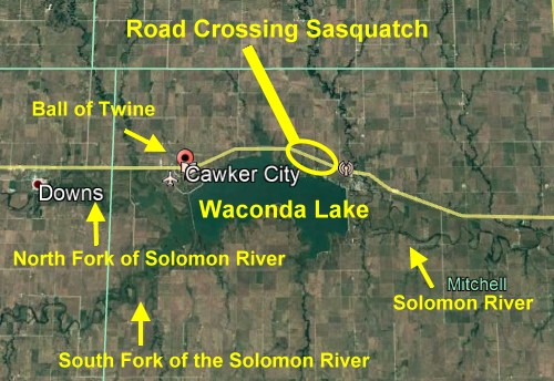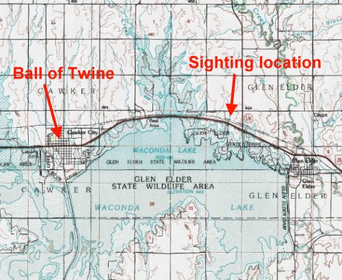 The specific area of this sighting was most likely close to the North boundary of Glen Elder State Park between "the ball of twine" in Cawker City and the tiny town of Glen Elder.