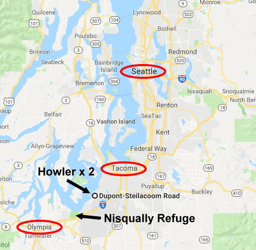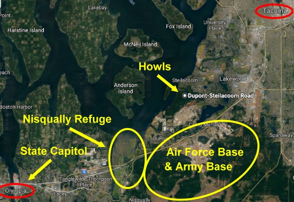 It would be especially helpful to know if Sasquatches inhabit the Nisqually National Wildlife refuge, not far from this howl location, south of Steilacoom and west of McChord Air Force Base, because Nisqually is right outside Olympia, where decisions about wildlife policy are made for the state of Washington.