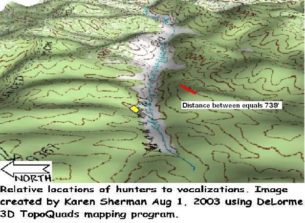 On the map below, the hunters' location is represented by a yellow square and the ridge of vocalizations by a red line. The distance between the two is approximately 740 feet (.14 miles.)