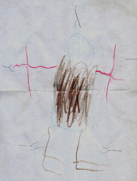 Based on his investigation of the child's experience, M estimates that the "monster" that frightened his son was seen at a distance of 50 to 60 yards. He sent me the pictures drawn by the five year old. The first was created purely from memory. The second picture was drawn after the boy saw a frame from the Patterson/Gimlin film featured on the BFRO’s web site. This was the picture that prompted the child, who had never seen a bigfoot image, to back away from the computer and shout, “That’s it!”