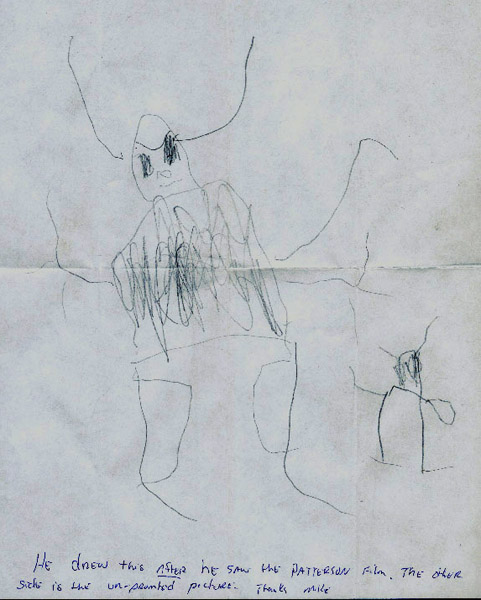 | | First picture: drawn purely from memory. |  | | Second picture: drawn after the boy saw a frame from the Patterson/Gimlin film featured on the BFRO’s web site. |