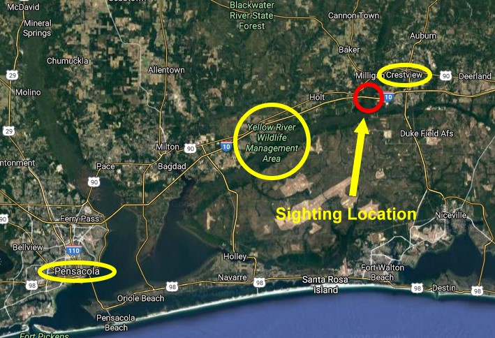 It seems there is a sasquatch which comes near the freeway every so often. It would likely be residing in the Yellow River Wildlife Management area. Keep your eyes peeled as you drive along Interstate 10 eastbound just before Crestview.