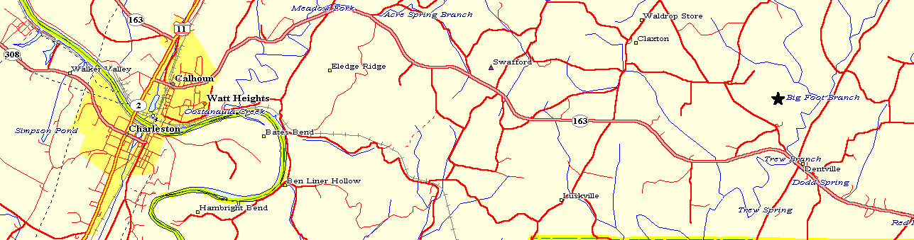 I typically do not use maps on reports, but after checking the map for this area, I came up with something interesting, there is a creek nearby this sighting bearing the name, Big Foot Branch as noted on the map below with a star marking its location.