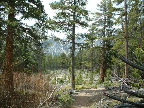 My sighting occured around 3:30pm at approximately. 11,500 feet. I was decending and very tired.The trail is not very popular because of its steepness and because it's very rugged in spots. I did not see anyone the whole day. I was traveling on the trail through the only level portion which is a high mountain plateau that lasts maybe 300 yards. The trail hugs an avalanche area to the left and to the right is a pine forest which is moderately dense.