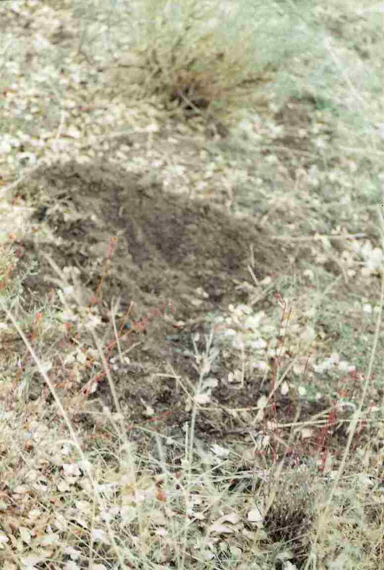 I attempted to follow in the direction of where the witness said he first sighted this creature; hoping to locate some tracks and/or impressions in the ground, but too much time had passed between the sightings and our investigation. I believe that time was about two to three weeks. Over a slight rise and out of sight of the witness, I located a dead bush/tree which at one time was about 8 ft. tall, but my first impression of it was the fact that something large had run through it, because it looked like it had just exploded. I did spend a little time looking for hair, with no luck. The direction this creature took was probably the fastest way for it to get away from the witness.