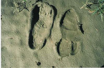 He submitted photographs for use with this report. One of the tracks is pictured in the first photo with his boot print next to it. He measured his boot sole to be 11 and 3/4 inches long and 4 and 3/4 inches wide at the ball of the foot. The impression it left will be a little larger. He bounced his weight up and down as he made this print, yet did not make as deep of an impression as the prints he was following.