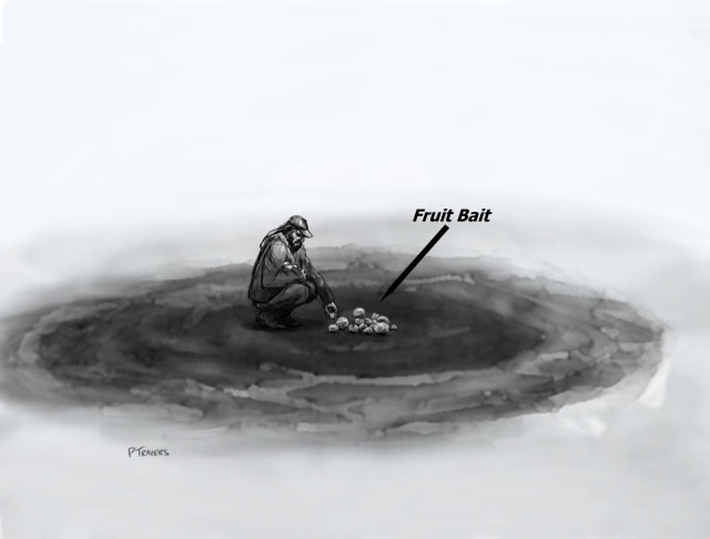 Around 2:30am vocalizations are heard in the distance, to the south of base camp. Around 3:00am a two man team drives toward where the sounds were heard and sets out fruit piles at a few different spots with soft soil, including the rainwater puddle.