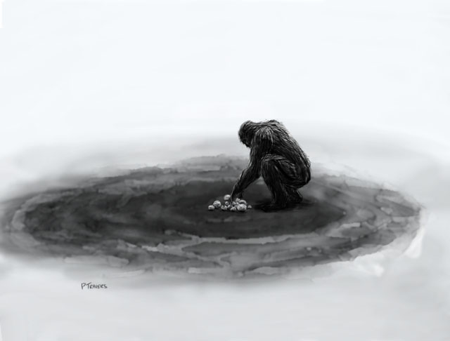 A sasquatch that would be drawn to the fruit, would, presumably, walk into the middle of the puddle to grab the fruit pieces. In the process it would leave clear footprints in the softest part of the mud.