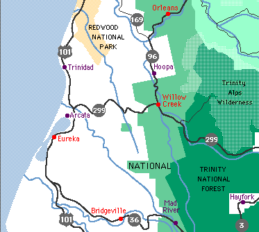 From Portland area: Drive south on Interstate 5 past Roseburg, and connect to Route 199 westbound toward Crescent City, California. In Crescent City take Highway 101 south to Arcata. In Arcata connect to Route 299 eastbound toward Redding. Willow Creek is near the intersection of Route 299 and Route 96.