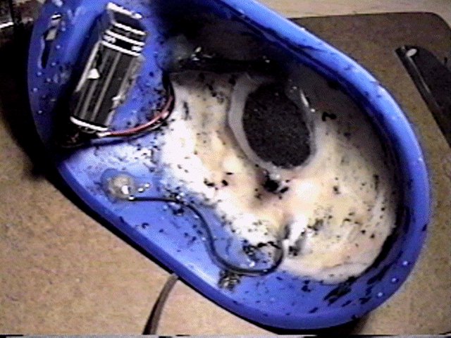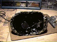 The black stuff you see on the under belly of the housing is some gunk called "Liquid Tape." It's used like electrician's tape but applied with a brush like liquid paper. On the second mic I built I used black candle wax, which removed the necessity for Liquid Tape.