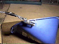 The next two pictures show the outside wall of the funnel with the antenna bolt protruding out of it. In the first picture an aligator clip is clamped onto the bolt. The aligator clip is connected to piece of mesh wire of the type used to hang a painting on a wall. The mesh wire is about three feet long and serves an extension for the short antenna wire that comes with the mic kit. I prefer this type of mesh wire as an antenna because of its great strength and flexibility.