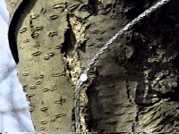 The following two pictures show how the mic is strapped to tree. The first one shows how the leather strap is used to strap to the tree trunk just underneath where a limb is branching out from the trunck. This is the best position to strap it because it allows you to point the funnel more veritically downward and while still enabling you to strap the mic tightly so it doesn't blow in the wind. Neither the mic nor the antenna wire should hang loose enough to blow in the wind, or else the signal from the mic won't be steady.