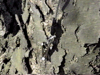 Just above the strips of tape you can see the aligator clip of the antenna wire clamped onto the antenna bolt. In the first picture you can just barely see the antenna wire extending horizontally from the mic to the trunk of the tree. The wire leads to a nail then goes straight down along the trunk as seen in the next set of pictures.