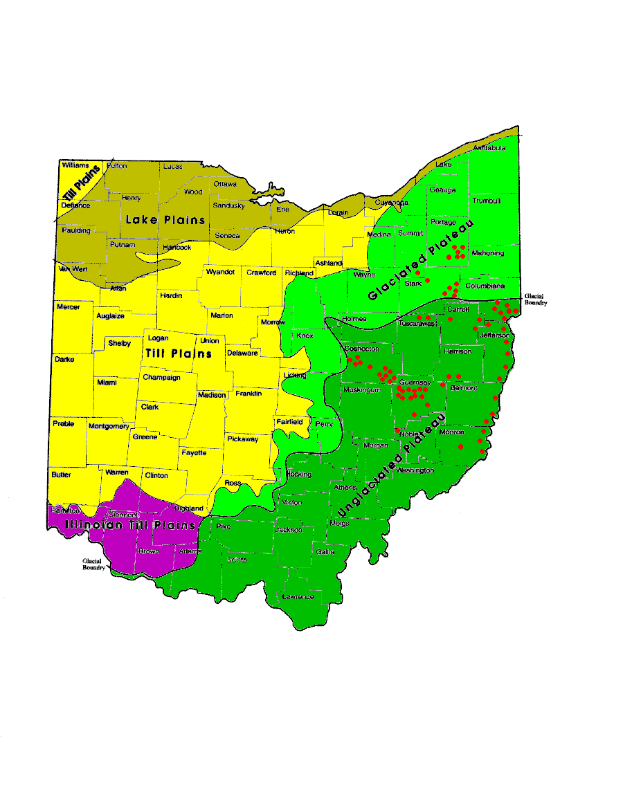 Observed in the area of Sharon, Ohio, on July 2nd 1984. The witness said she stood about 25 feet from the creature. The sighting occured in daylight. The lady had brought her children to a playground located in a relatively unpopulated, hilly, wooded area, not far from her home. She was supervising them at play when the incident occurred. First she heard some rustling in the woods on the edge of the playground. When she walked over to see what it was, she observed the creature moving slowly through the trees and bushes toward the edge of the grassy field where she stood. It stopped at a point where it could view the children playing on a small merry-go-round. She believed the animal was attracted by the noise of the children. After observing it for a moment or two, she calmly gathered up the children and drove away. This drawing is closely based on a drawing made by an artist at the direction of the witness. The distribution of eastern Ohio bigfoot reports over the past 20 years is roughly depicted on this map, which also shows the major physiographic regions of Ohio and county borders. The red dots do not represent individual sightings but rather relative concentrations of sighting reports and track finds which are known to various bigfoot researchers. One can expect certain human variables to influence this apparent distribution to a limited extent. For example: