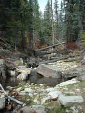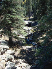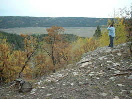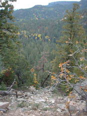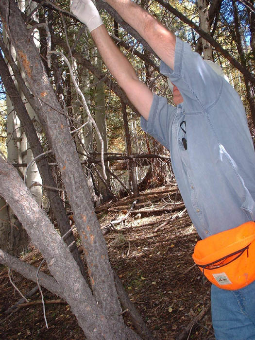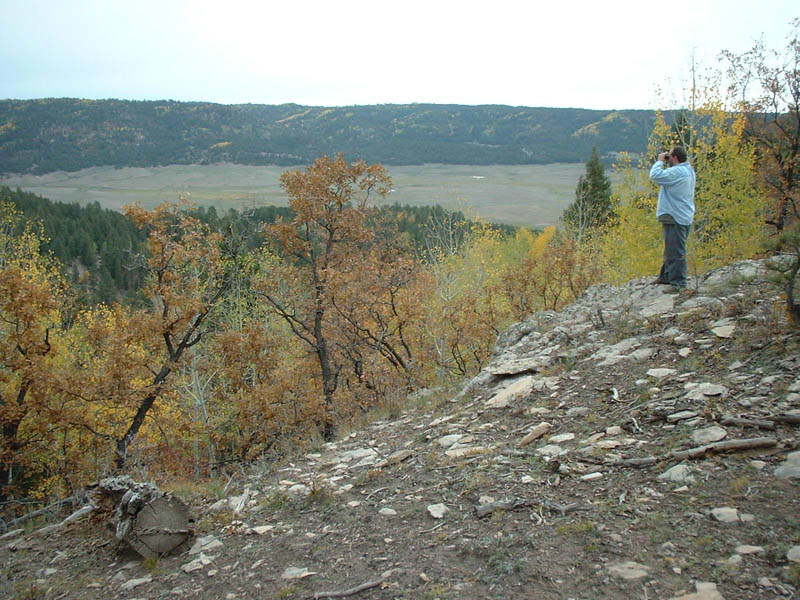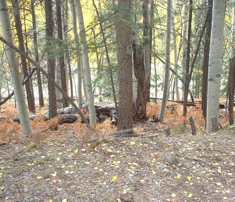 First Pheromone Trap using the Trail CameraMovement throughout the Chuska Mountains is possible by four-wheel-drive vehicle using old logging roads. We were able to travel fairly easily over these, and we widely spaced our pheromone and scent traps within the approximately four by two mile area encompassing the fresh water sources. Two sets approximately three miles apart were made with pheromone chips. The first was placed about a fourth of the way down a drainage that cut through the lip of an ancient caldera and spilled onto the great, open basin that had been the center of the once fiery cone. The sunken grassy plain that blankets the caldera basin is about a mile and a half in diameter, and the surrounding lip, which rises several hundred feet, is covered with ponderosa pine and aspen. Cold, clear water now springs from the floor of this once hot ground and collects to form two streams. Over time, these have cut through the caldera lip and formed deep canyons in working their way down slope. The drainage where we put the first pheromone set, along with the flowing canyons that also cut into the cone on the opposite side of the mountain, form gaps, interruptions in the continuity of the caldera's wooded rim. Since the basin of the caldera is wide open, we reasoned that a secretive animal moving through the area would circumnavigate the caldera by traveling up along its wooded rim. And when it encountered this drainage it would have to drop into it in order to continue on around. And it seemed likely that in doing that the animal would negotiate the drainage by moving along its easier grades rather than cutting right across it by skidding down and climbing up its steepest sides. The pheromone scent would drift up and down through this small, bisecting valley so that any animal cutting through would likely smell it. We placed two chips up toward the head of the drainage where it began to tighten in. One was wired seven feet up onto the branch of a small tree growing in the bottom of the drainage. Up one side from there was a small meadow and above that was an aspen grove. On the back side of the aspens where the slope began to sweep steeply up was an old, blocked off logging road, a trail, really, which ran down the drainage. The second pheromone chip was placed about 100 yards up the wooded slope above the trail. We reasoned that a sasquatch might be interested but confused or worried about the pheromone scent -- after all, it wasn't real sasquatch pheromone. And even if it was perceived as being real, a sasquatch smelling it might be afraid of an animal it didn't know. Of course it was also an artificial situation, and any indications of that would add to a sasquatch's concern. So instead of training the camera on one of the chips -- the focal point not only of interest, but also of concern -- we positioned it to take advantage of the evasive behavior that would likely dictate a sasquatch's approach. The old logging trail ran between the two, somewhat distant chips -- each was about 100 yards away.? It offered concealment, easy movement, and a view through the aspens and down across the meadow, below which the bottom chip was located. The second chip, high up the wooded slope in the opposite direction, might also be worried over from the trail below. And, with the aroma wafting back and forth, the two chips were likely to create a scented zone there in the upper drainage; the abandoned road would be a logical place for a cautious animal to move as it checked out the situation. It was a good place for our camera trap. We mounted it on the trunk of a young spruce tree so it "looked" across the trail and upon the slope behind. The Second Pheromone TrapAbout four miles southwest of there and down the mountain some, Reid dropped me off on the high divide separating the two canyons mentioned earlier. I scrambled all the way down to the creek to hunt for tracks as I followed it back up to its origin in the caldera basin. Reid went on to make another pheromone set. As he came around the tip of this high divide, the unique spot that overlooks the junction of the two canyons, he found an open place with beautiful tracking soil. There, nighttime air currents would carry the pheromone scent down into the confluence of the two drainages. Daytime currents would bring the aroma up the high slope above. As with the first pheromone set, he placed two separated chips. One was wired into an oak tree just over the edge of the overlook, and the other some fifty yards up the slope on the opposite side of the tracking bed. Like the first, it was wired six feet up into an oak tree. Hiking Up and Exploring the First CanyonThe small, clear stream could be crossed in two steps in most places. Small mud flats were found intermittently along the watercourse. These contained only deer and small animal tracks. Old black bear droppings were seen once along a game trail which followed the stream, but no bear tracks. Beavers had been in there, but not recently. Upon a flat bench along the creek was found a very old sweat lodge, its roof fallen in. Tracking conditions were generally good; it was a wild, beautiful place, but no sasquatch sign was seen. Setting the Food Scent TrapsThat first evening we put food essence oils out in four locations. As with the pheromone, we put scent in two or more places at each location in order to make the source of the aromas unclear.? Locations well apart from one another, with good ground for tracking and where the scents would drift into promising looking areas, were chosen. Sweet corn, apple, acorn, and nutmeg were used -- a different scent for each of the locations. ExploringWe spent a lot of time exploring the mountains by driving around on the logging roads and hiking. Since the ground was so good for tracking it was as good a way as any of learning what animals were in the area, and possibly to determine if sasquatches were among them. That country is beautiful; we saw dozens 