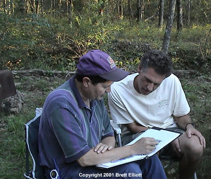 Alton Higgins and Curt Nelson review aerial photographs of the study site.
