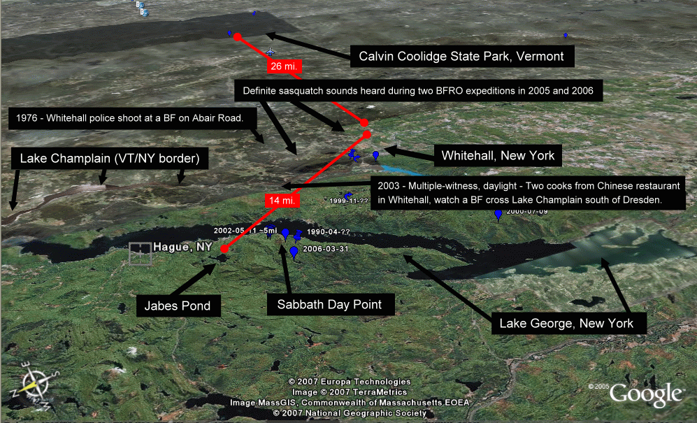 The blue markers in this Google Earth frame represent incident locations on the Mangani Bigfoot Layer. The black and white labels were added by the editor of this report. Mangani's locations are based mainly on BFRO reports. They are incomplete and