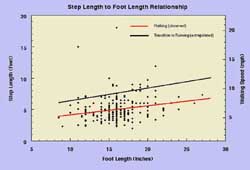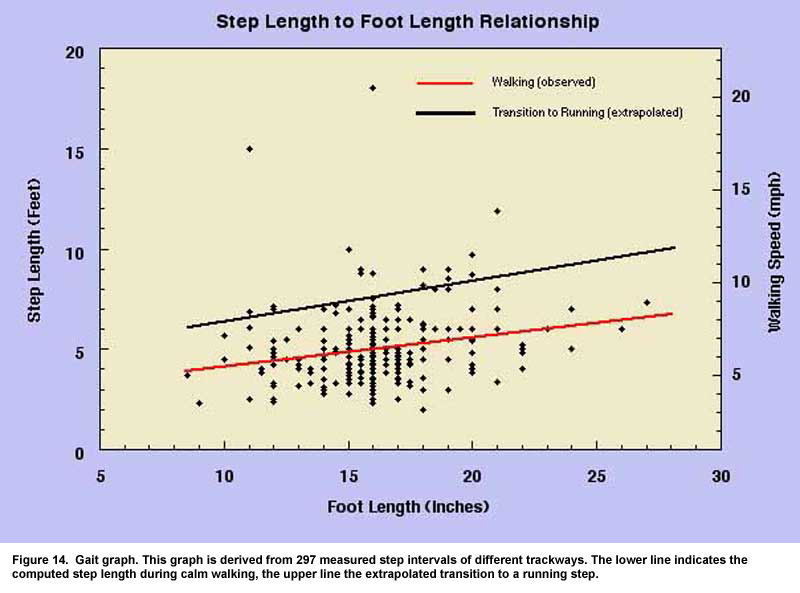 Behavior | Most sasquatches are observed walking, and the observer almost invariably comments on their smooth, long and fluent stride ("like cross country skiing" or "like riding a bicycle") with wide arm swings. This effect is produced by their so-called compliant gait, meaning that they do not lock their knees during a step but keep them bent and thereby suppress the up-and-down oscillations of the upper body that is so characteristic of the human gait. Part of the sasquatch gait is a high foot rise in back during the swing phase and a longer bipedal contact with the ground. Step length averages 5’ (Fig. 14), an interval that is uncomfortable or impossible to duplicate or sustain for any distance by a would-be hoaxer. The gait has very little straddle, i.e., feet are put in line.