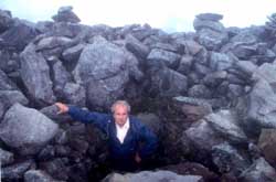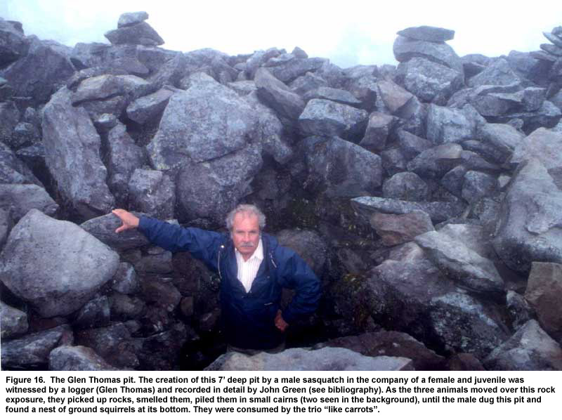 Two noteworthy facets of sasquatch behavior have been observed repeatedly. They seem to be rather "orderly", stacking rocks in cairns during searching (Fig. 16) and not tearing human food caches or backpacks apart randomly in the manner of bears. Secondly, they have a tendency to leave "gifts" in the same location in which food was deposited for them. These can range from little piles of stones, a dog skull, handfuls of evergreen shoots, to small live animals, like a goat kid, several live kittens, a turtle, all taken from elsewhere, either as a "gift" or possibly as shared "food".