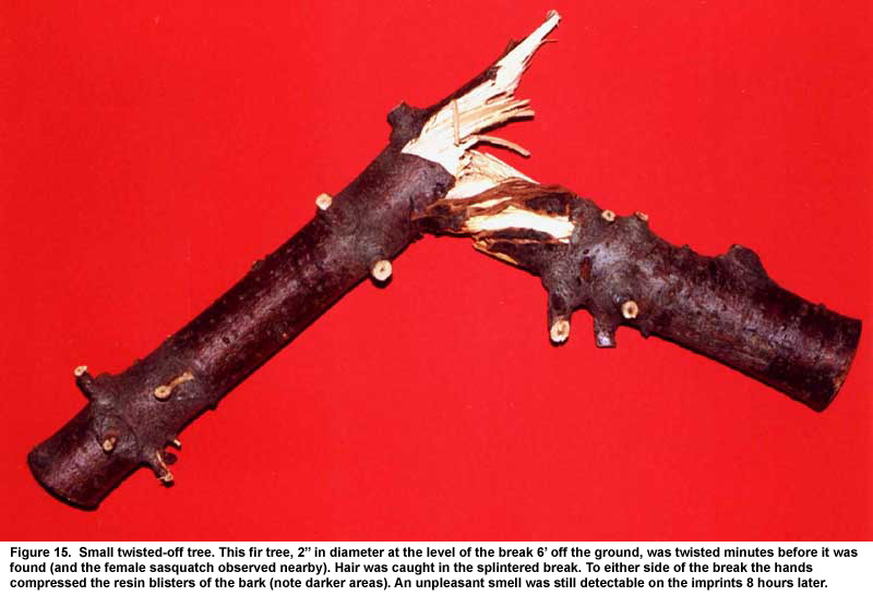 Their strength, especially upper body, is legendary. They seem to take "pleasure" in exercising this strength, for example, lifting basketball-sized rocks and throwing them in arcs to scare off intruders, lifting the edges of mobile homes, cars or trailers, lifting and throwing full 50 gal. drums (450 lbs.) or 240 lb rocks (weighed later), and spirally twisting the trunks of small trees, possibly as territorial or way markers (Fig. 15).