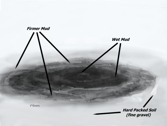 The September 2000 BFRO expedition in the Gifford Pinchot National Forest (Washington state) provided an opportunity to test BFRO research methods. One method for determining the presence of sasquatches in a given area involves setting out certain fruits, in particular ways, in specific situations. The method is designed to yield evidence: Residual evidence such as tracks, or physical evidence such as saliva or hairs. At one point during the expedition small piles of fruit where left at various spots in the general area. All of the spots had soft or wet soil. One of the fruit piles was set in the middle of a shallow puddle of fresh rainwater. The underlying mud in the puddle would allow for clear tracks of any animals attracted to the fruit pile. The puddle was surrounded by an area of hard packed soil -- fine gravel that would not permit tracks even when wet. As the rainwater seeped into the ground, outter rings of increasingly softer mud would be exposed.