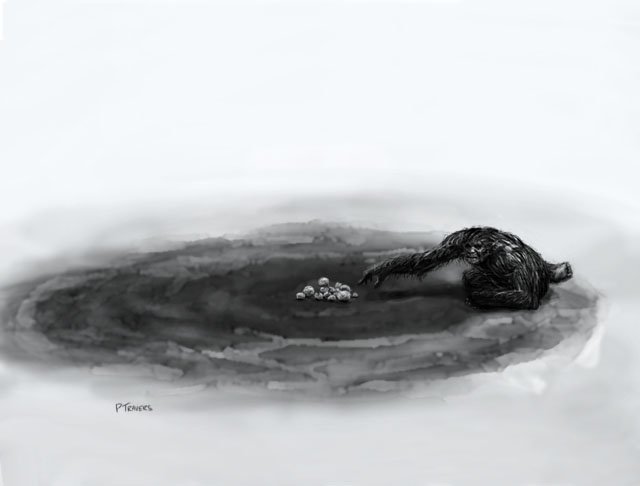 Instead of walking into the water, the sasquatch carefully lays down at the perimeter of the water and reaches out to grab some pieces of fruit.