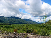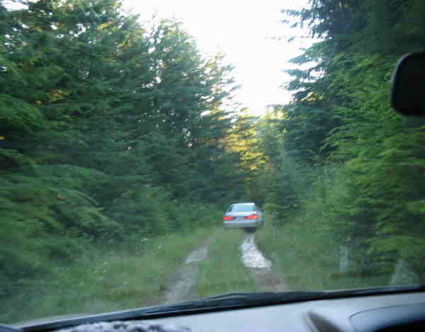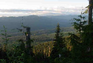 at ~40 feet, looking out from behind a tree along a logging