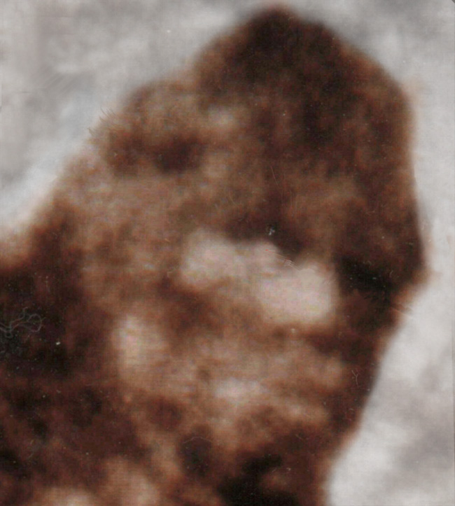 The sketch was done as an overlay to the original. This sketch has no real scientific value, unless, of course, we can prove the Patterson/Gimlin film is authentic. It is interesting to note the relationship of facial features, where the nose and mouth are very large in proportion to the eyes. More information about the Patterson footage.